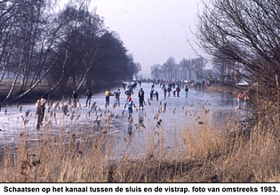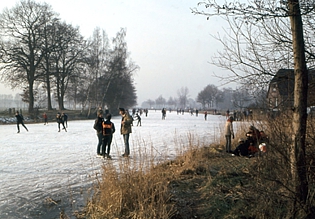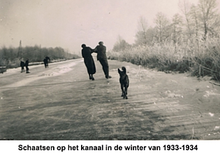 In de winter werd hier overal geschaatst. Op het kanaal, maar ook op overgelopen weilanden en poelen. “Peters plas” was favoriet onder de jeugd. Verlichting was er uiteraard niet, maar zodra het volle maan was, werd er tot in de late uurtjes over het ijs gezwierd. Van het één kwam het ander en in deze ijskoude avonden ontstond hier dan ook de nodige romantiek.