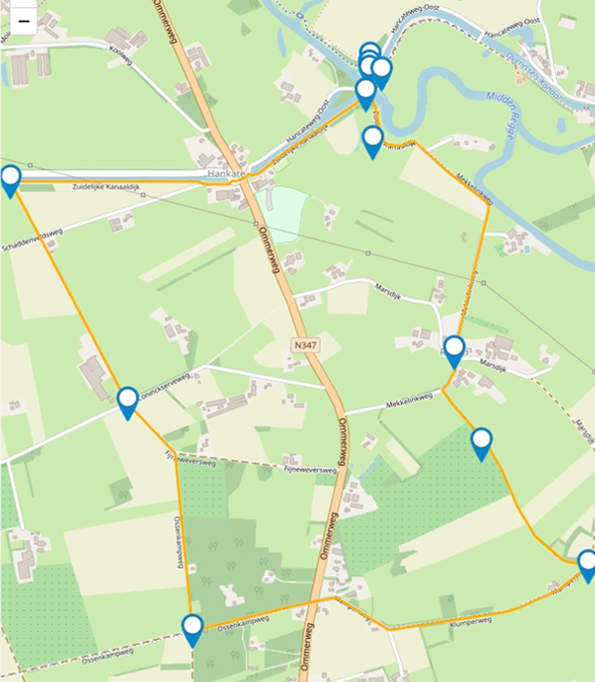 Het begin van deze route lijkt veel op de groene route. Echter aangekomen op de Reefhuisweg, maakt deze route nog een mooie slinger in de richting van Den Ham via de Voorslagenweg en de Hillegersweg. Dan via de Meersendijk en de Lusseveldweg meandert u weer richting Overijssels Kanaal.